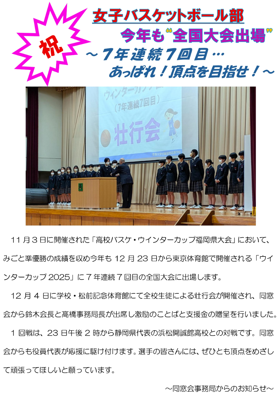 最新情報 トップページ最新情報女子バスケットボール部 今年も\全国大会出場/ 最新情報 2025年12月5日 女子バスケットボール部 今年も\全国大会出場/ コメントする コメントをキャンセルメールアドレスが公開されることはありません。 ※ が付いている欄は必須項目です名前 ※ メール ※ サイト コメント ※ Δ 最新情報 最新の行事について 事務局からのお知らせ