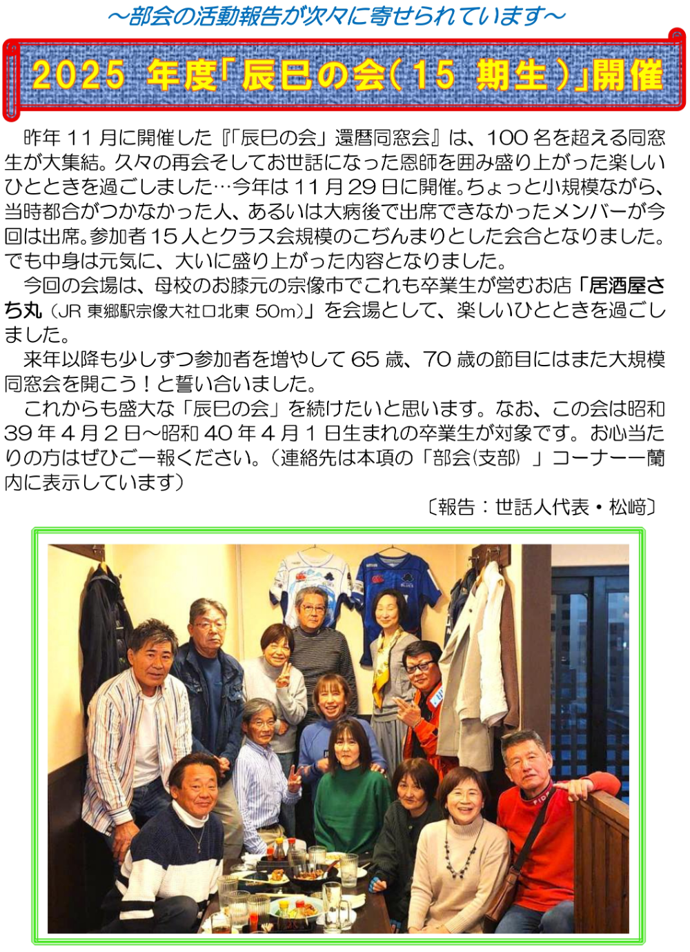 同期会 トップページ部会(支部)活動同期会2025年度「辰巳の会(15期生)」開催 同期会 2025年12月8日 2025年度「辰巳の会(15期生)」開催 コメントする コメントをキャンセルメールアドレスが公開されることはありません。 ※ が付いている欄は必須項目です名前 ※ メール ※ サイト コメント ※ Δ 部会(支部)活動 同期会 五高会 その他